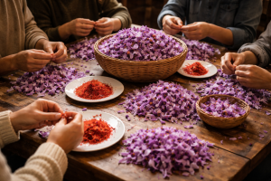 ¿Qué es exactamente la Monda del azafrán? La Monda es el proceso de separación manual y minuciosa de los tres estigmas rojos (las hebras) del resto de la flor morada (Crocus Sativus). Esta tarea se realiza justo después de la recolección, y debe hacerse con suma rapidez para evitar que los estigmas pierdan sus propiedades. Es un trabajo que requiere destreza, paciencia y, sobre todo, muchas manos.